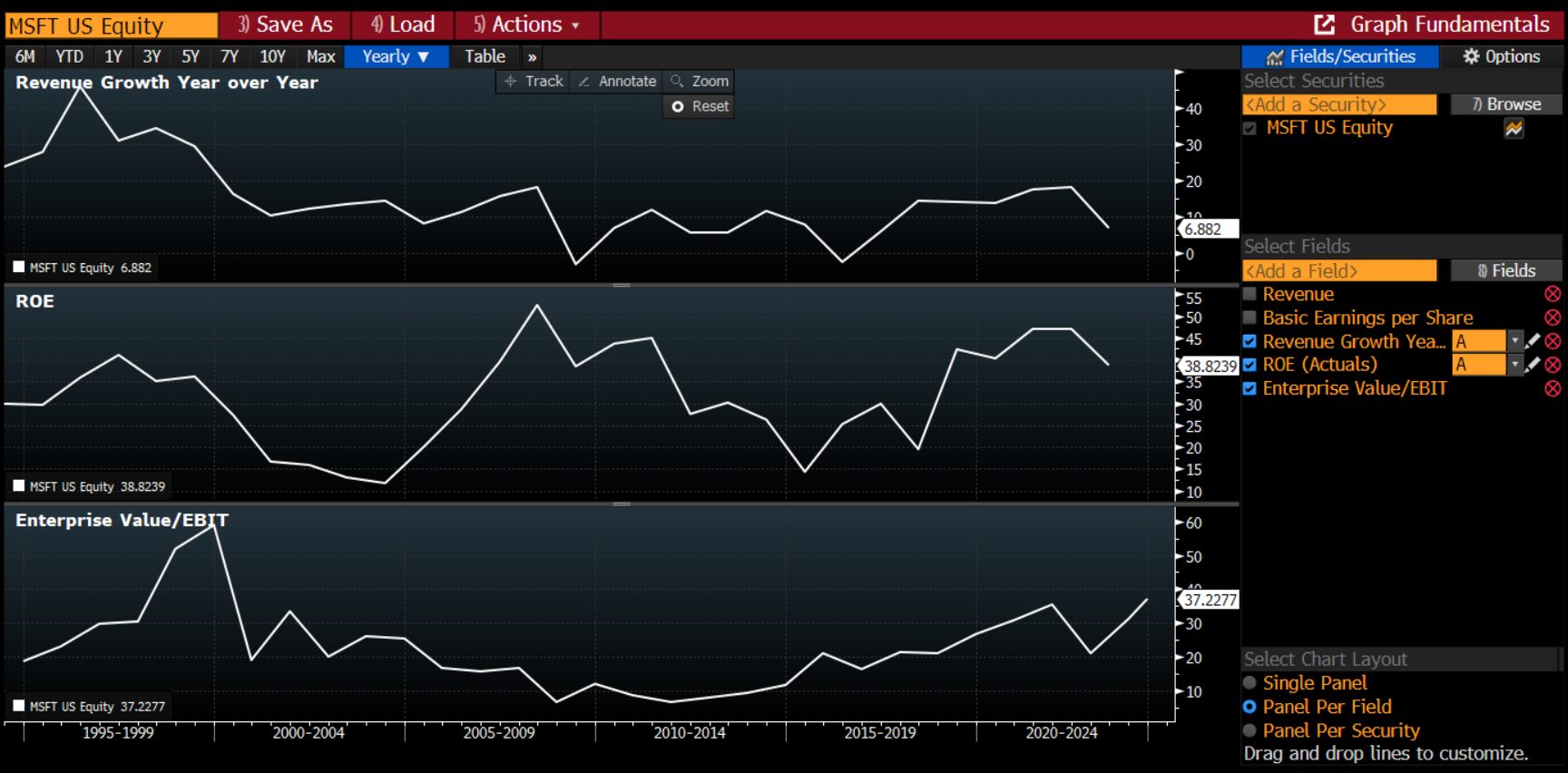 For example, Microsoft was obviously a very good company in 1999. At that point in time, the trailing 12m revenue growth was > 30%, and the ROE > 40%. There was a problem, however. The valuation reflected this quality and then some. The trailing 12m EV/EBIT multiple was 59x! That EV/EBIT multiple would contract all the way to < 10x by year end 2012. (Recently, the EV/EBIT multiple has expanded again to almost 40x, and MSFT shares are up >2000% since early 2012). Clearly, valuation matters a great deal over long time periods (but very little in the short term).